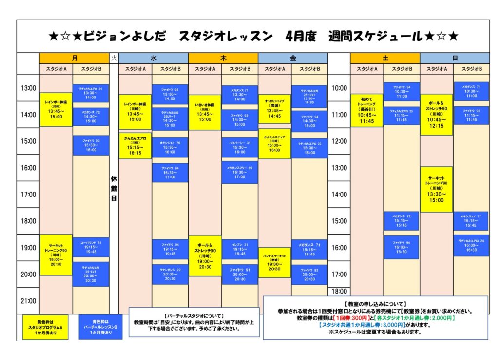 ビジョンよしだスタジオ教室4月度分スケジュールを更新いたしました