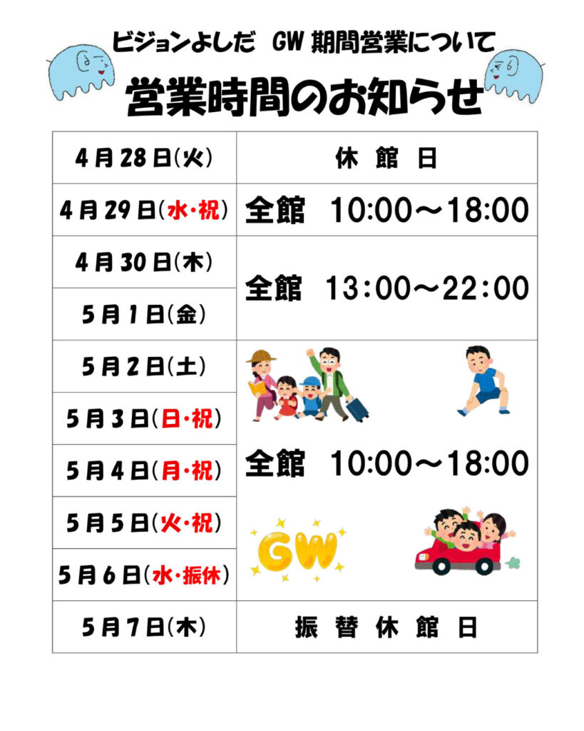 ビジョンよしだではゴールデンウィークの期間中営業時間が通常と異なります